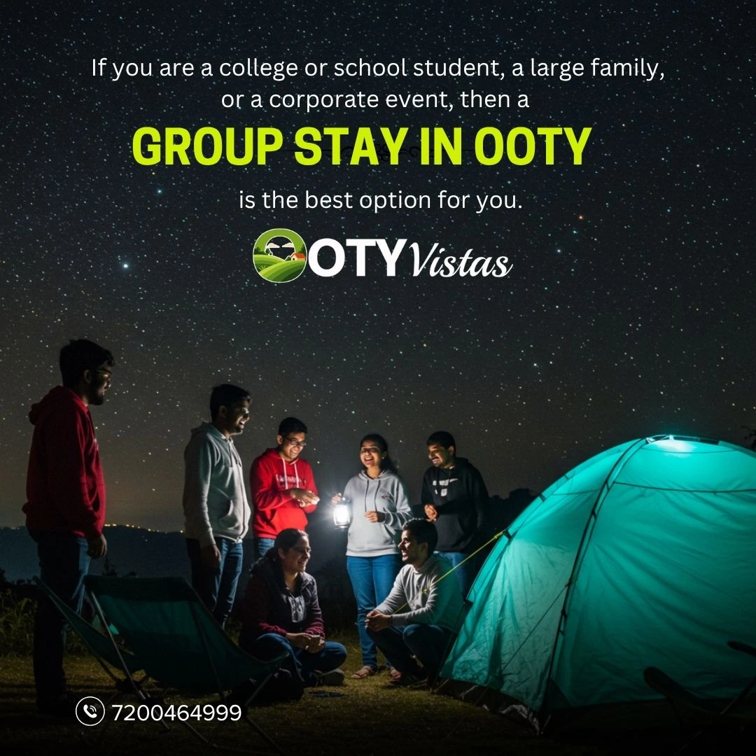 Ooty Vistas provides several types of accommodations for groups, such as cottages, homestays, resorts, and dormitories.